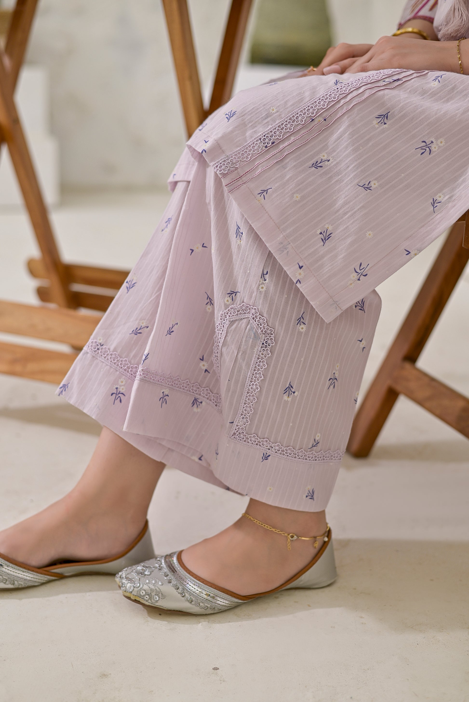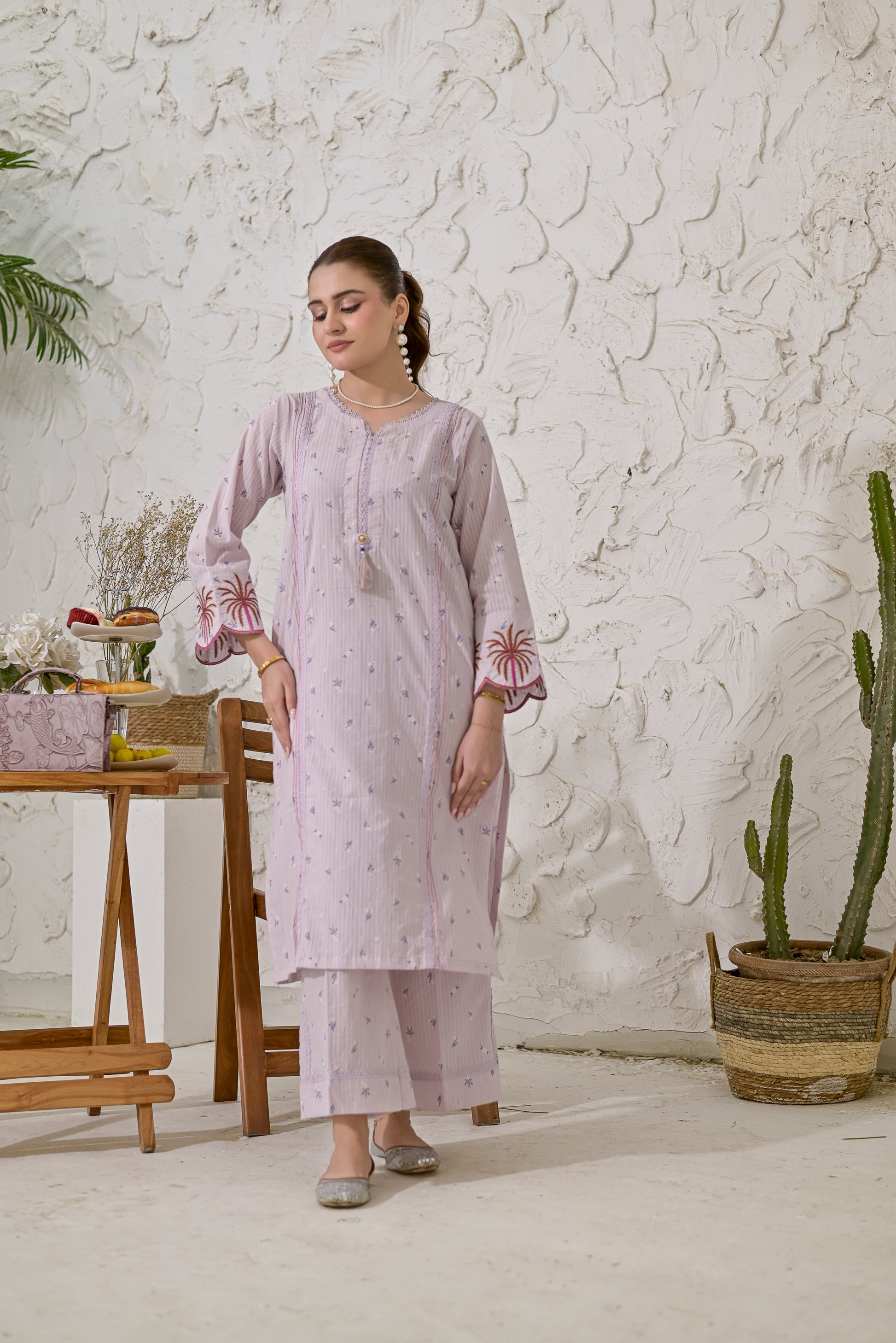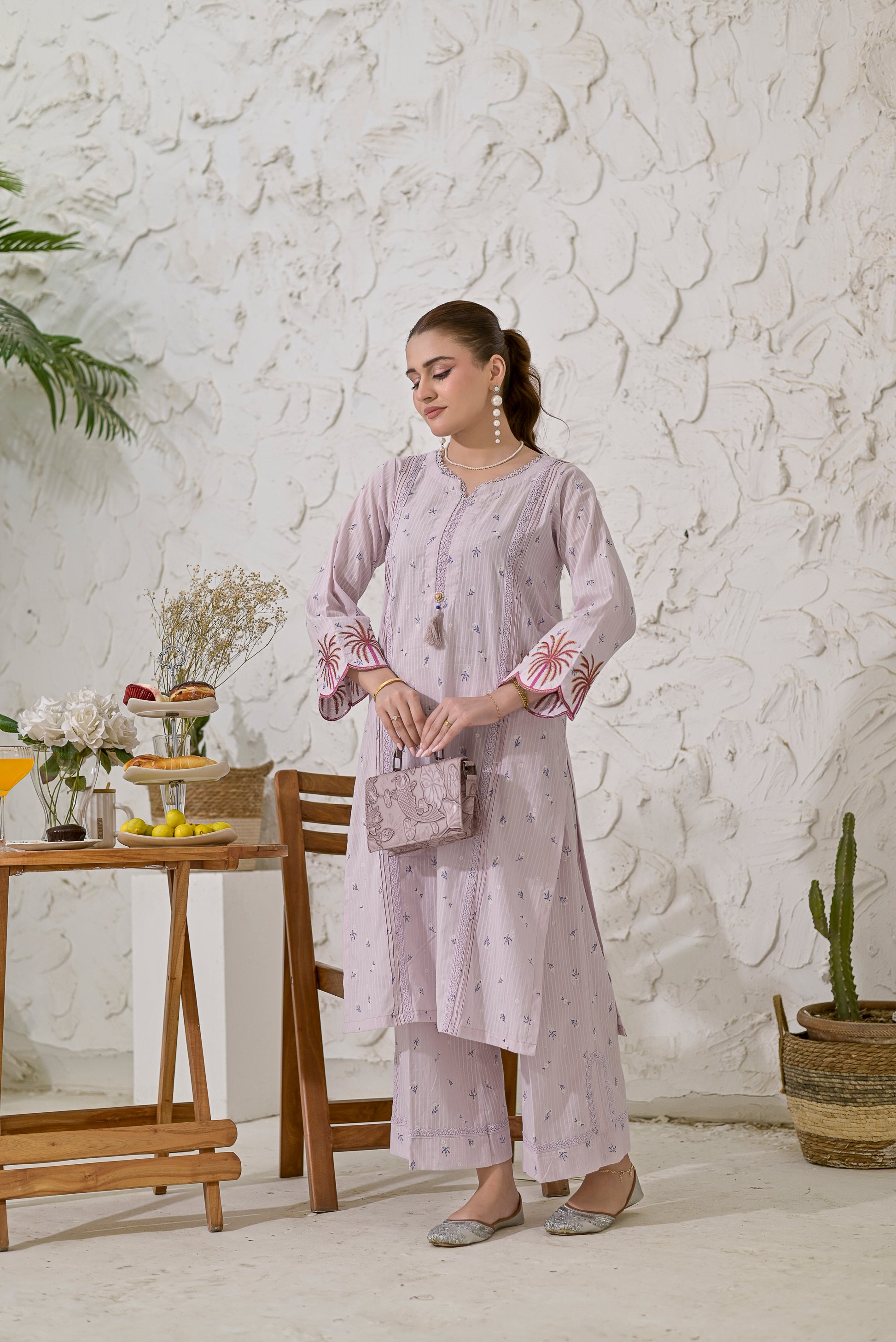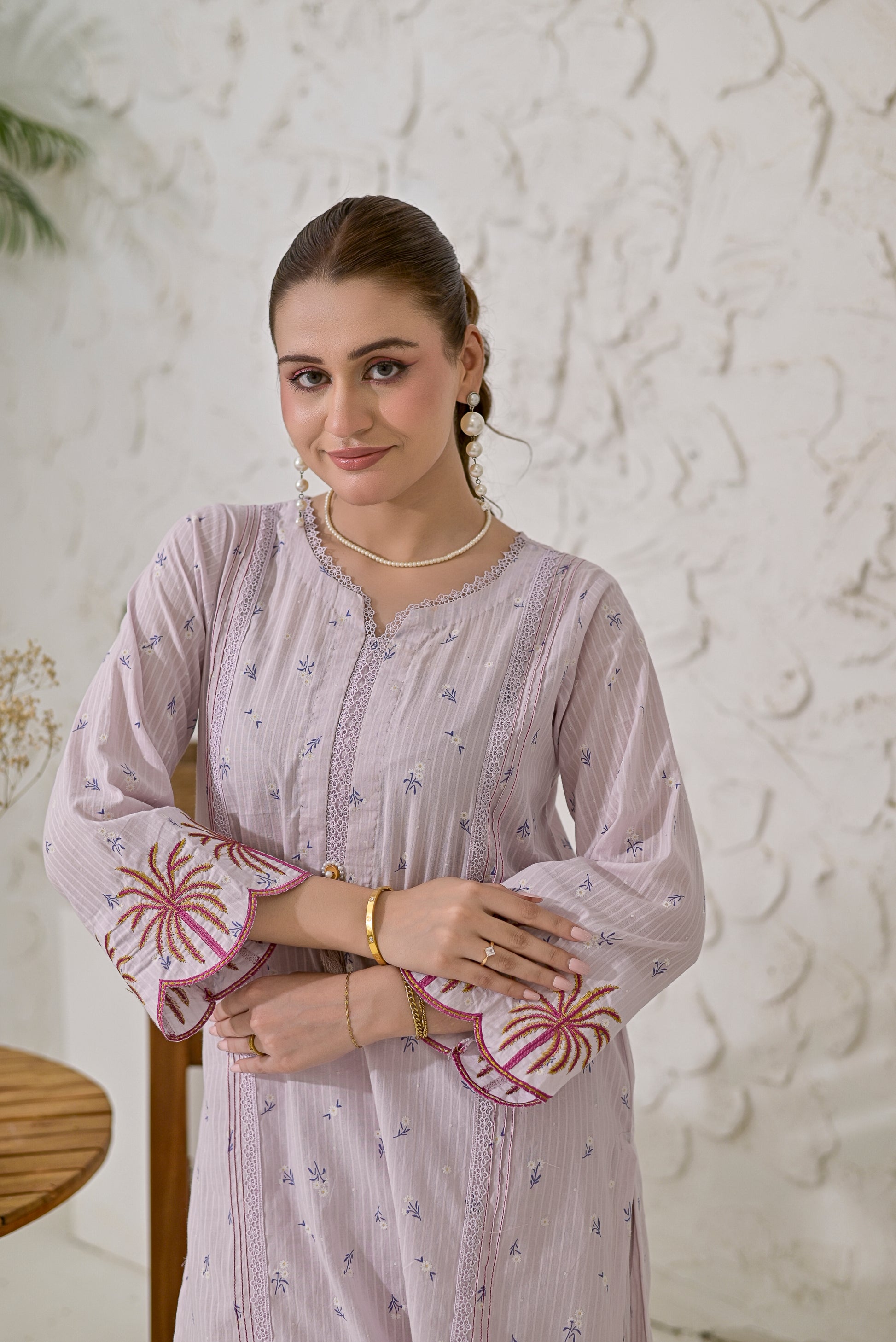 Stitched Details : Long shirt with very beautiful sleeve palm tree embroidery with contrasting color Styled with front tassel, detailed with stitches and lace on sleeve Paired with culottes with lace finishing.