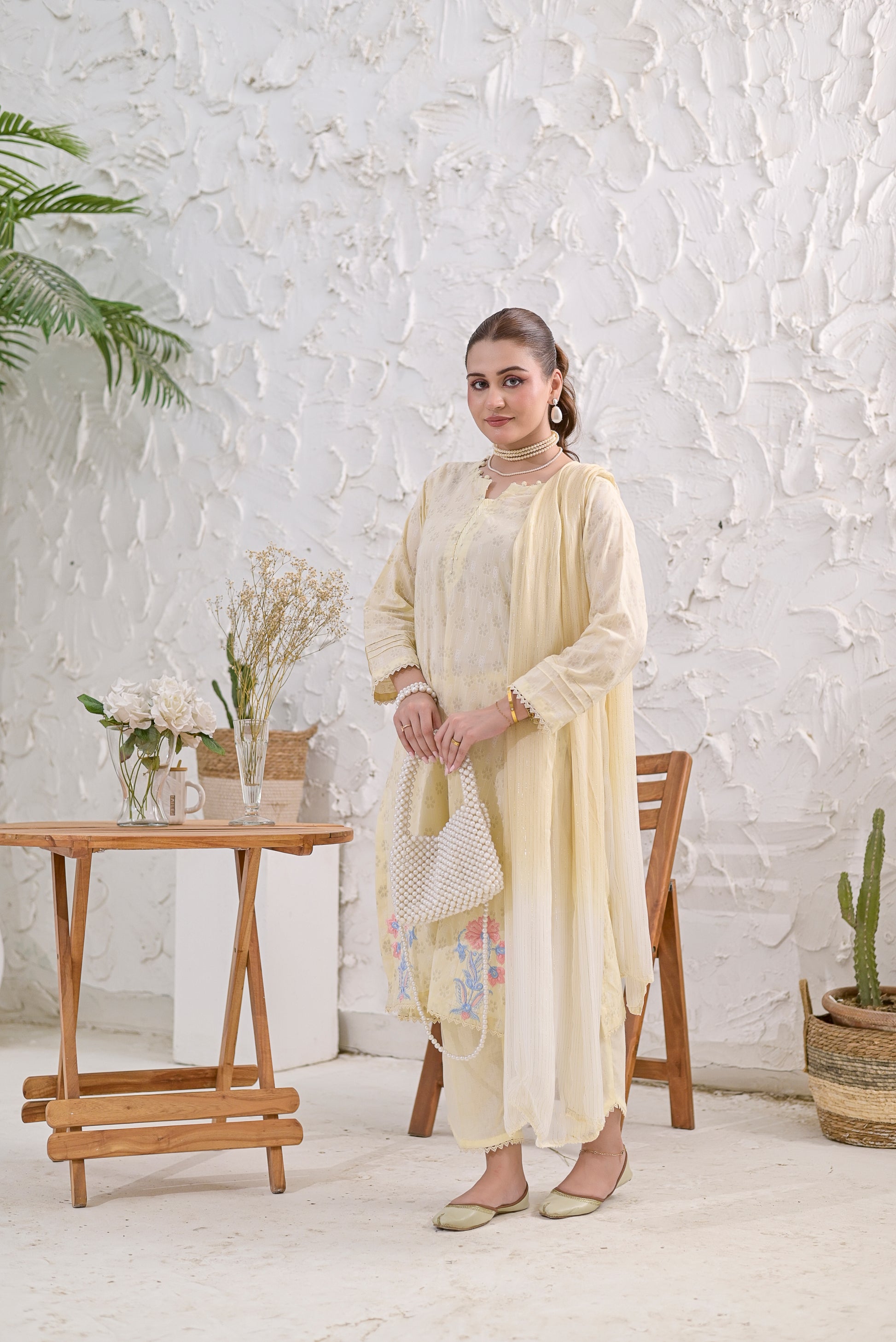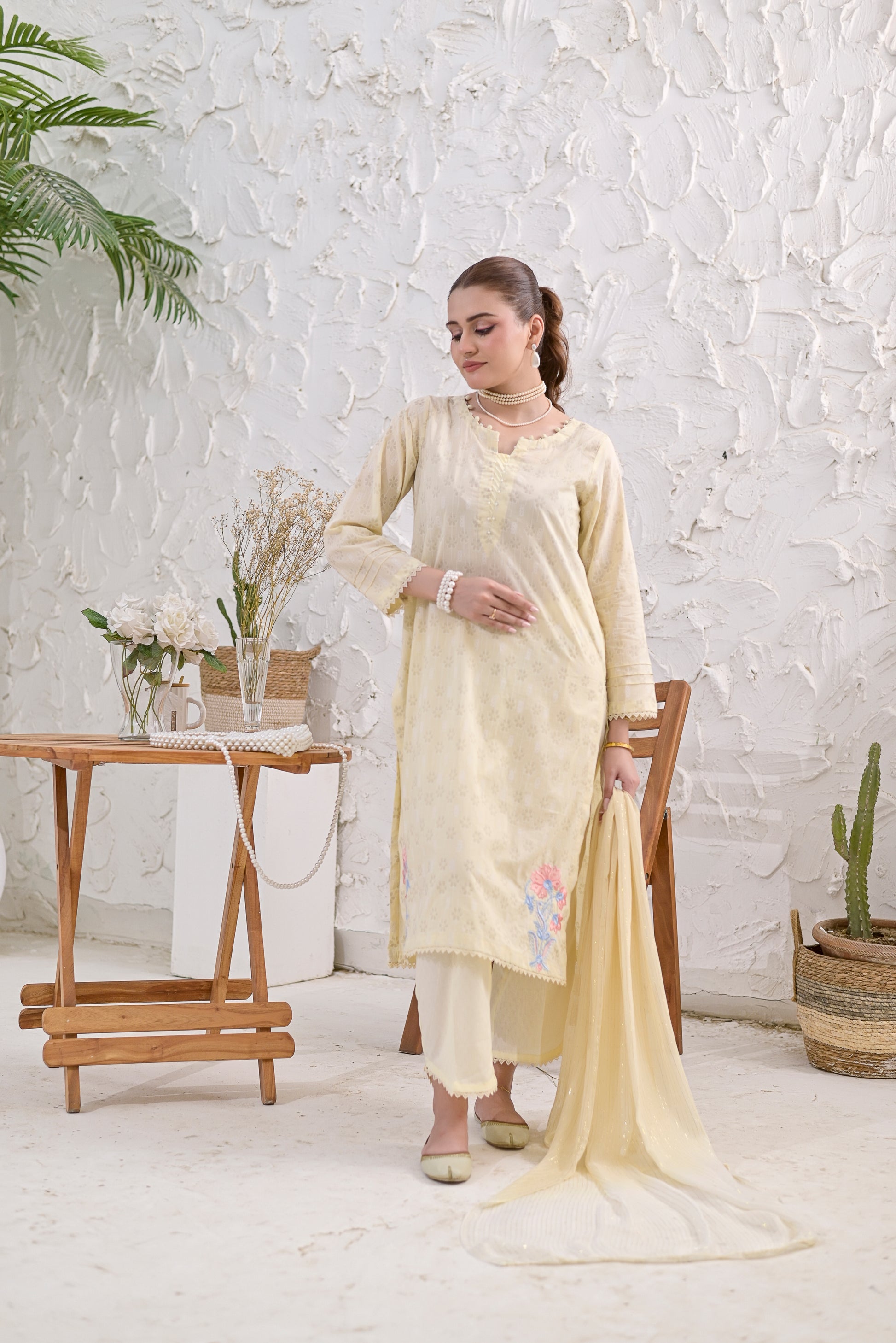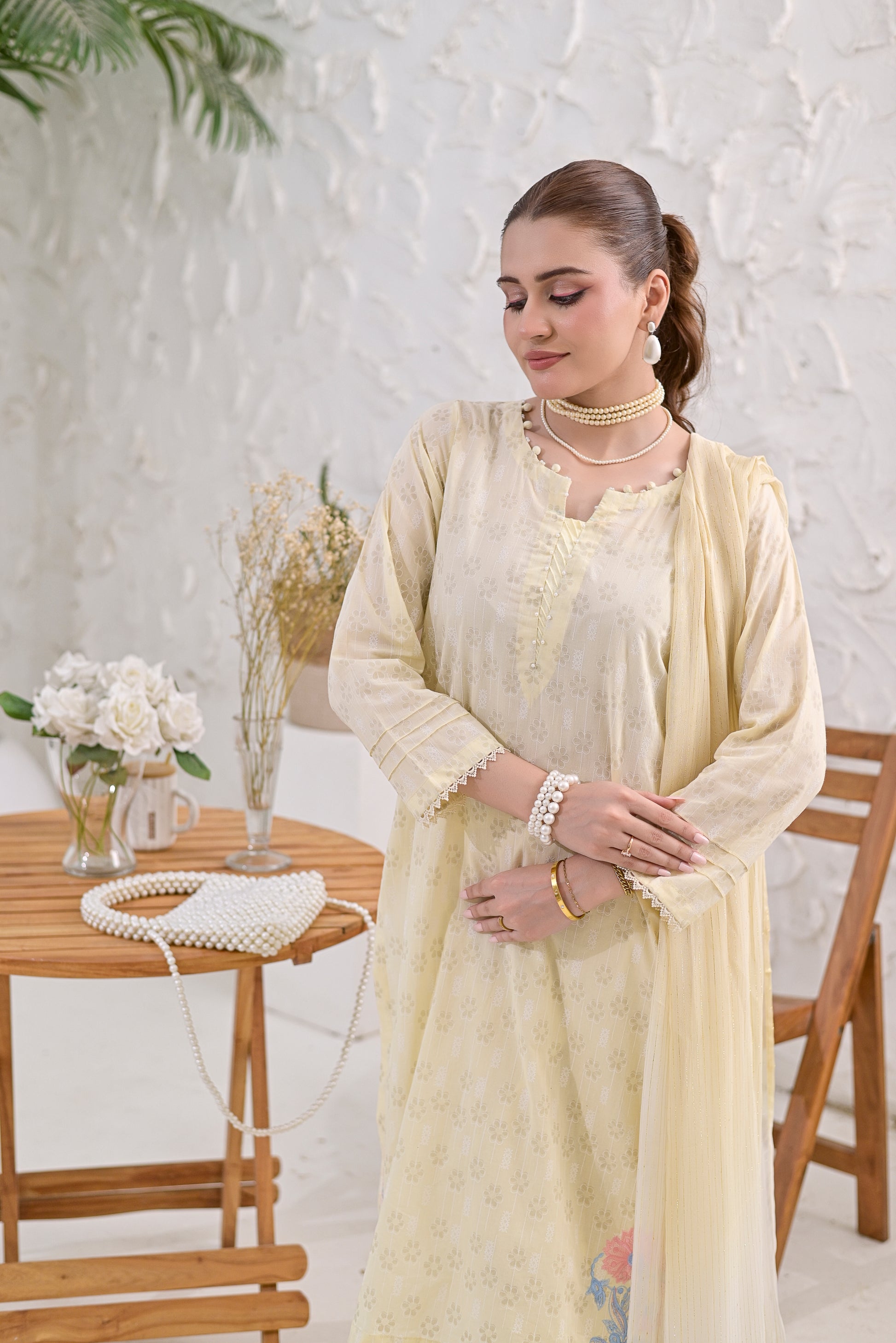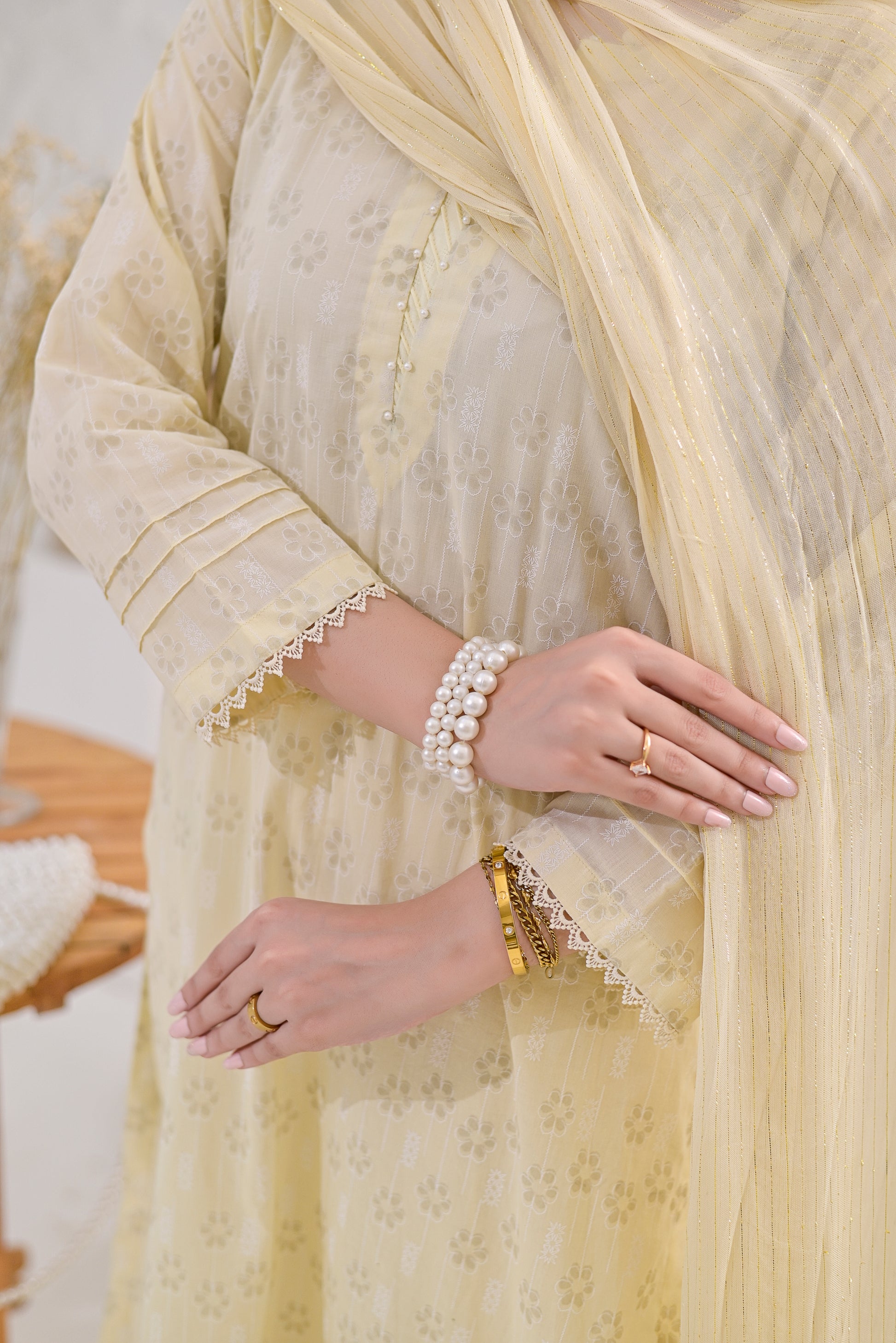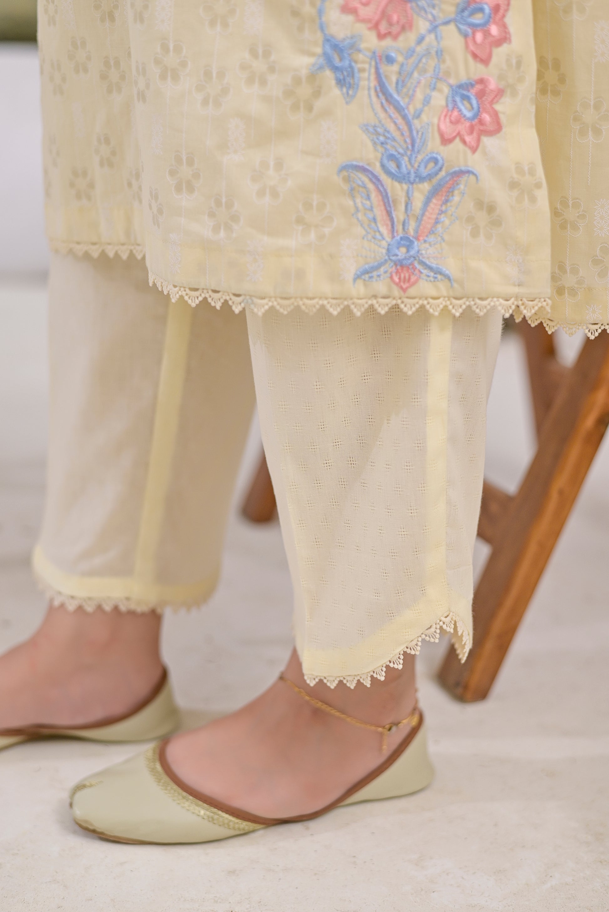 Stitched Details: shirt : straight shirt with detailed pearl attached on neckline, embroidery bunches on Daman. Lace detailing on sleeves and trouser peared with the straight culottes